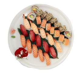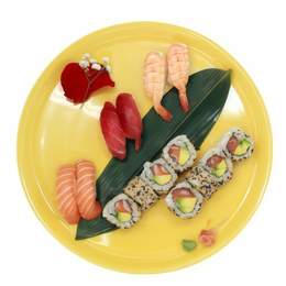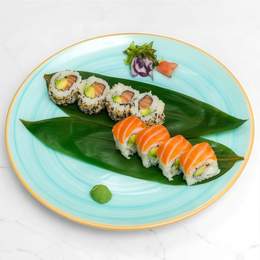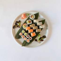 2 tipos de 4 uramaki/california rolls, 2 maki salmón, 2 maki pescado blanco de temporada/salmón, 2 maki atún, 2 maki aguacate