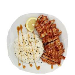 Arroz blanco con pechuga de pollo empanada crujiente y salsa teriyaki