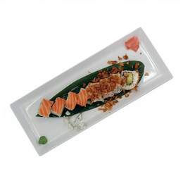 4 uramaki de ceba crujiente, Philadelphia, aguacate y surimi + 4 uramaki de salmón y aguacate + 4 makis de salmón + 2 makis de atún + 2 makis de aguacate + 4 nigiri de salmón