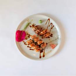 8pieza de sombrero salmón con aguacate y surimi flambeado y dos niguiri de salmón dos niguiri de atún flambeado con salsa teriyaki