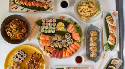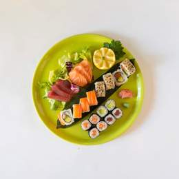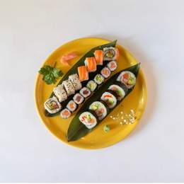 4 uramaki sombrero de salmón, Philadelphia, aguacate y surimi + 4 California de salmón, aguacate, surimi, pepino y mayonesa + 4 makis de salmón + 4 makis de aguacate + 3 sashimi de salmón + 3 sashimi de atún