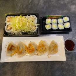 4 uramaki de salmón, agaucate y sésamo + 4 uramaki de ceba crujiente, queso Philadelphia, aguacate y surimi + 4 California de salmón, pepino, aguacate, surimi y mayonesa + 4 uramaki sombrero de salmón, Philadelphia, aguacate y surimi