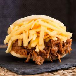 Crujiente masa de maíz precocida sin gluten, rellena de jugosa carne de res deshebrada.