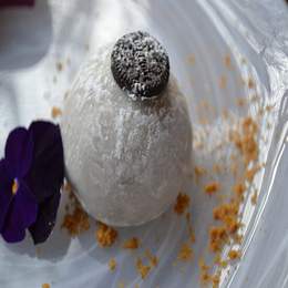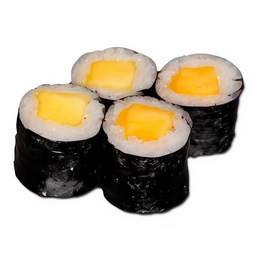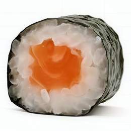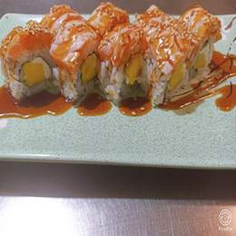 Rollo grande de alga nori grande con arroz, foie con manzana caramelizada en tempura y salsa unagui