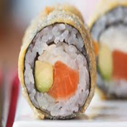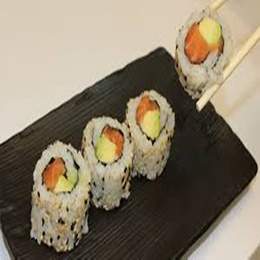 Rollito invertido de arroz relleno de aguacate, tomate seco, mango y sésamo