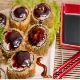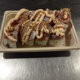 Rollo grande de alga nori grande con arroz, foie y anguila en tempura y salsa unagui