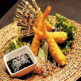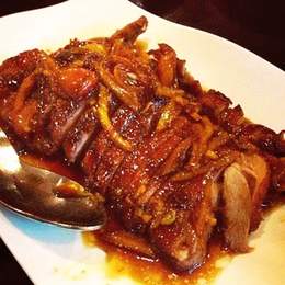 Pato rebozado estilo japonés sobre arroz con salsa Teriyaki