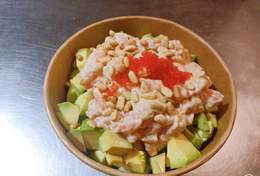 Bol de arroz sushi con tartar de salmón , aguacate y tobikko,piñones