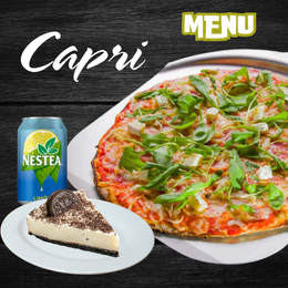 Tomate, mozzarella, jamón York, pollo, piña y emmental