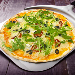 Tomate, mozzarella, jamón York, cebolla pochada, Rulo de cabra, emmental y rúcula.