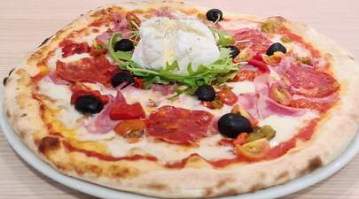Tomate, mozzarella, jamón cocido, champiñones, alcachofas, alcaparras, aceitunas