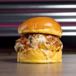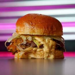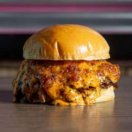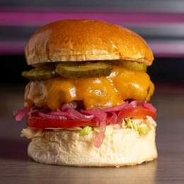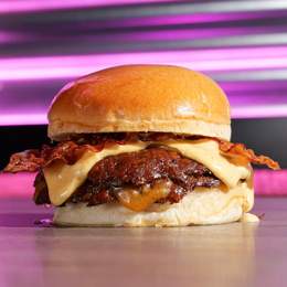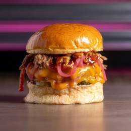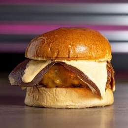 180gr de nuestra Dry Aged 40 días, cheddar rojo, cheddar blanco madurado, crema secreta, salsa burger al más puro estilo vibra y bacon bits.