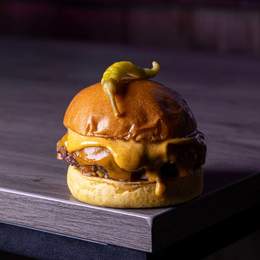 180 g de nuestra carne Dry Aged madurada 40 días, queso cheddar rojo, queso cheddar blanco madurado, cebolla caramelizada, nuestros finísimos aros de cebolla caseros y salsa suave de trufa negra ahumada.