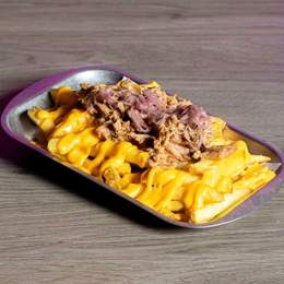 Patatas fritas cubiertas de cheddar cream, pulled pork, salsa barbacoa y cebolla morada encurtida.
