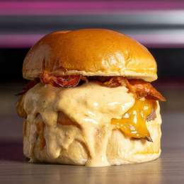 2x90gr de nuestro blend smash, doble queso cheddar rojo, doble bacon crujiente y nuestra salsa burger.