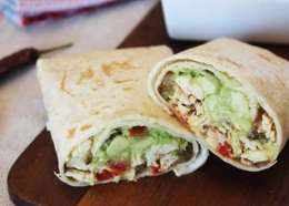Tortilla de trigo rellena de pollo, sofrito de pimientos, guacamole, queso, lechuga y salsa de yogur