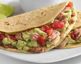 Tortillas de maíz rellenas de atún, aguacate, cebolla morada y crema agria