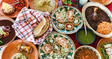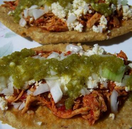 Tortillas de maíz fritas, untadas de frijoles, carne, pollo o mixtos, cebolla desflemada, tomate y guacamole