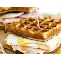 Nuestro super gofre saladito se compone de dos gofres de nuestra masa casera recién hecha y relleno de jamón York queso y huevo frito.. no podrás creerlo !!!