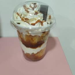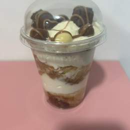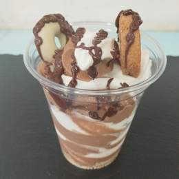 Delicioso Sandy para los amantes del Kinder bueno con topping de Kinder, bolitas tres chocolates y sirope Kinder bueno