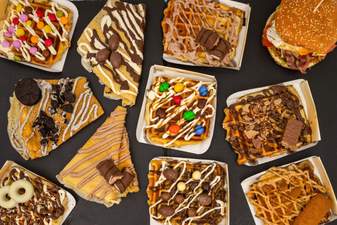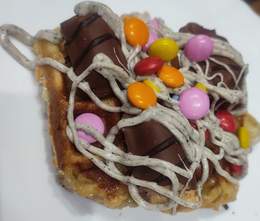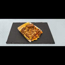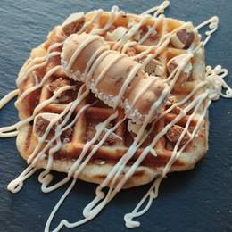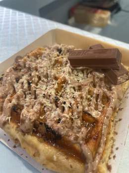 Gofre con sirope de Kinder bueno, lluvia de choco blanco y negro y topping de kit kat