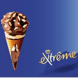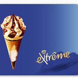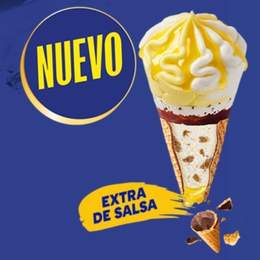 Helado de vainilla con toppings de almendras y salsa de chocolate, todo ello envuelto en un crujiente barquillo terminado en una riquísima punta de chocolate.