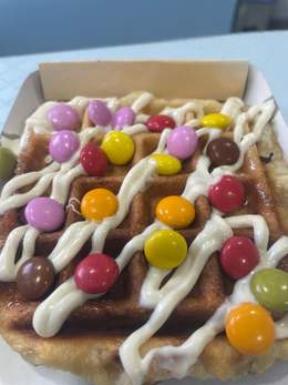 Gofre con sirope chocolate blanco y topping de lacasitos