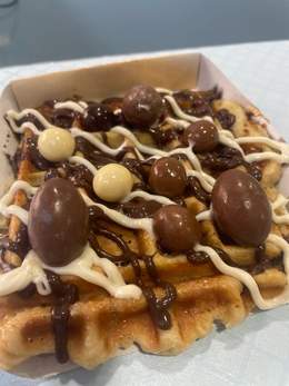 Delicioso gofre con sirope de Nutella y chocolate blanco y topping de shocobons y