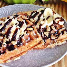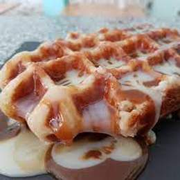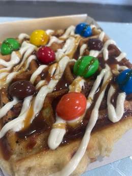 Gofre con sirope de dulce de leche y chocolate blanco y topping de emanems