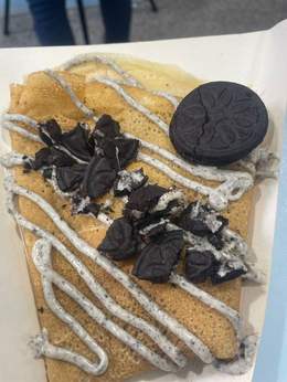 Delicioso crep con sirope Nutella y choco blanco, topping de filipinos y nieve de azúcar glas