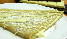 Nuestro crep te sorprenderá con sirope chocolate blanco y topping bolitas choco blanco