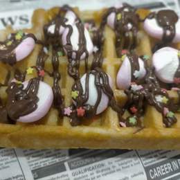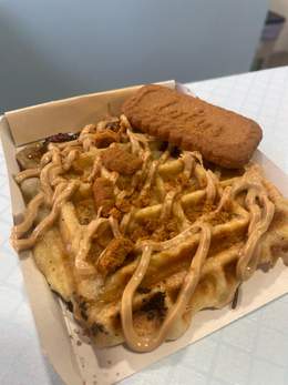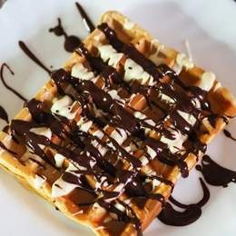 Delicioso gofre con topping de chips ahoy y sirope de chocolate blanco. Deliciosamente irresistible !!