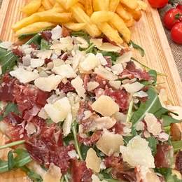 Ternera (Bistec de 150 grs ) adobada con especias argentinas, empanada y frita, con salsa de tomate, mozzarella, rúcula, viruta de jamon iberico y mozzarella acompañado de patatas fritas