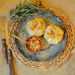 El sabor de pollo asado, dentro de una empanada, junto a un sofrito casero de cebolla y pimientos