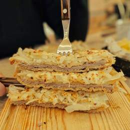 Ternera (Bistec de 150 grs ) adobada con especias argentinas, empanada y frita, cebolla caramelizada y muzzarella.