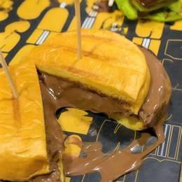 Panecillo brioche con sesamo negro, beicon ahumado, queso cheddar, cebolla, huevo frito, salsa be smash . Acompañada con patatas fritas.