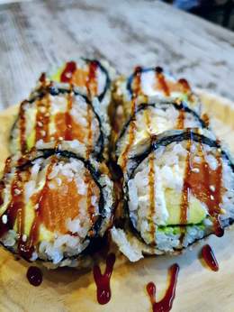 En japonés, la palabra maki significa “rollo”. El maki sushi es por tanto un rollo de alga nori relleno de arroz y salmón