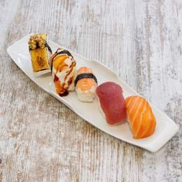 El nigiri es un sushi compuesto por una bola de arroz que se moldea con la mano sobre la que se sirve un trozo de pescado crudo, en este caso salmón.