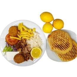 Carne de ternera y pollo, ensalada turca, dos hojas de parra, 2 falafel, un trozo de queso tipo feta, patatas fritas, salsas, 2 panes, 2 bebidas y 2 helados.