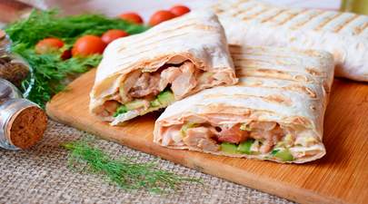 Pan Lebanos. Carne y pollo, lechuga, tomate, cebolla y salsas.