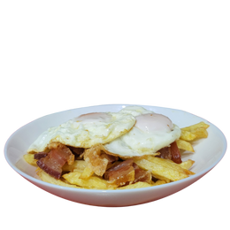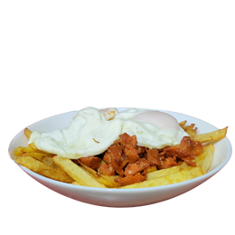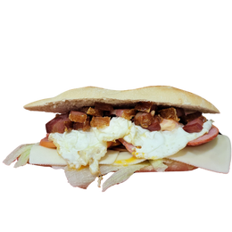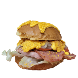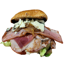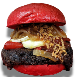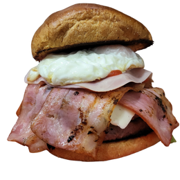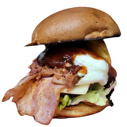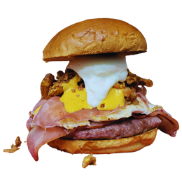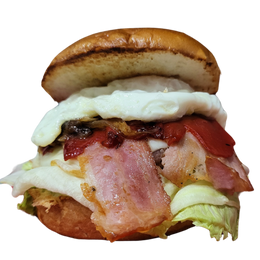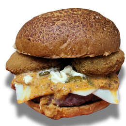 Pan Brioche high potato rolls, carne de chuleton madurada 180gr, queso cheddar, queso gouda, bacón crunchy, huevo frito, mayotrufada y cebolla crispy