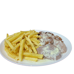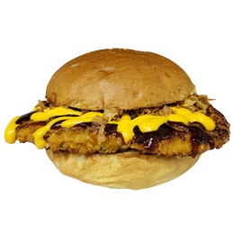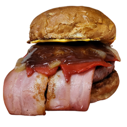 Pan Brioche black, carne chuleton madurada 180gr, salsa BBQ, queso cheddar, bacón crujiente y aros de cebolla