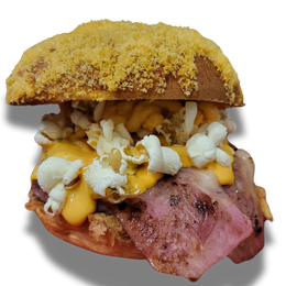 Pan Brioche patata, carne chuleton madurada 180gr, triple queso cheddar, bacón crunchy, pulled pork, salsa jack Daniels y maiz mr corn (grefusa)