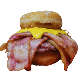 Pan donuts glaseado, carne ternera 180gr, queso cheddar, doble de bacón caramelizado en sirope de arce, crema de caramelo werther's y crispy de caramelo werther's