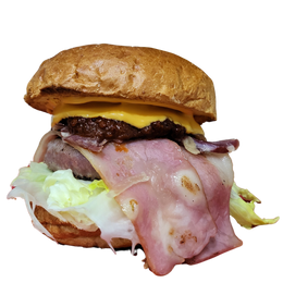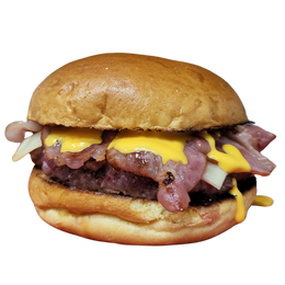 Pan Brioche, carne de ternera, doble bacón, queso edam y queso cheddar