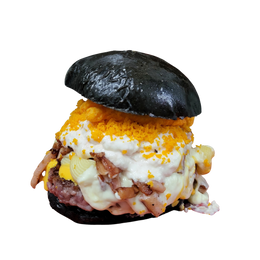 Pan Brioche black, carne chuleton madurada 180gr, queso cheddar, mac y cheese, bacón bits, mayo bacón, polvo de risketos risi y risketos