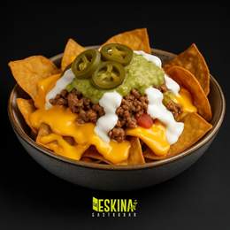 Con carne especiada, chili suave, guacamole casero, pico de gallo fresco, salsa agria y queso cheddar fundido