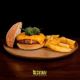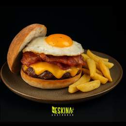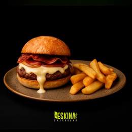 Queso crema bacon, pimiento asado, tomate deshidratado y salsa burger con patatas caseras