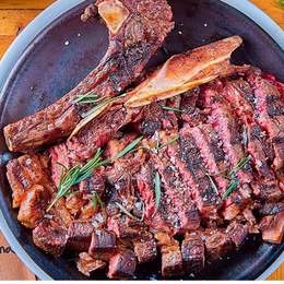 Parrillada de carnes: costilla bbq, morcilla, chorizo criollo, entraña, pollo campero acompañada de mazorca a la parrilla, pimientos de la casa, chimichurri ahumado y patatas caseras