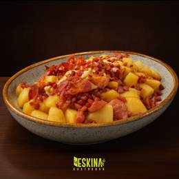 Patatas caseras con crema de quesos fundidos, bacon crujiente y jamón serrano